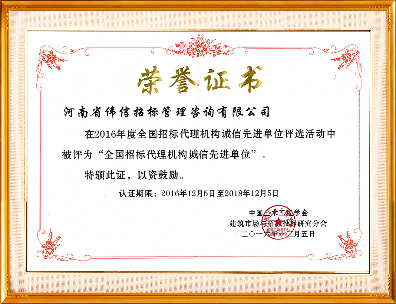 2016年全國招標(biāo)代理誠信先進單位