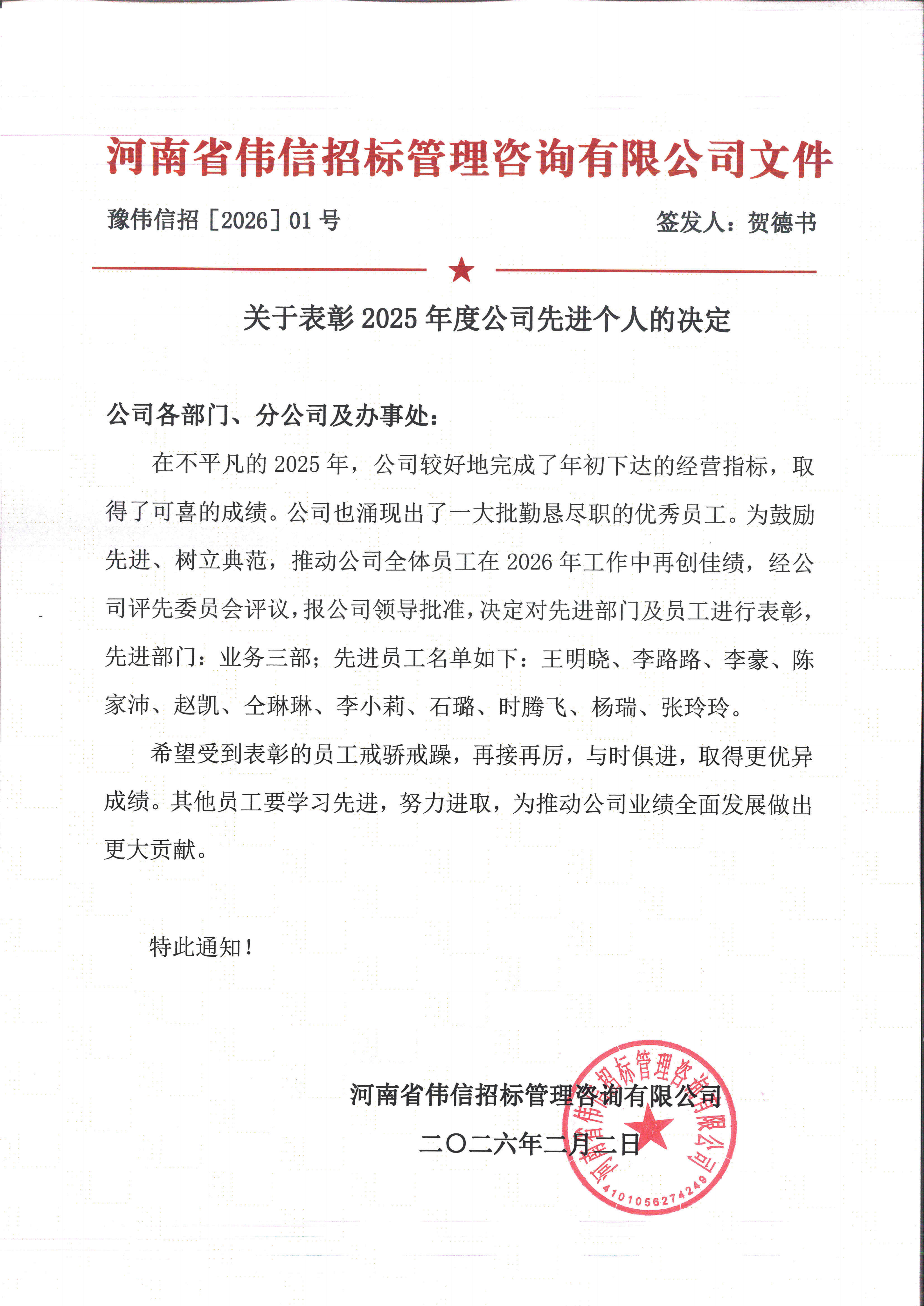 關(guān)于表彰2025年度公司先進個人的決定