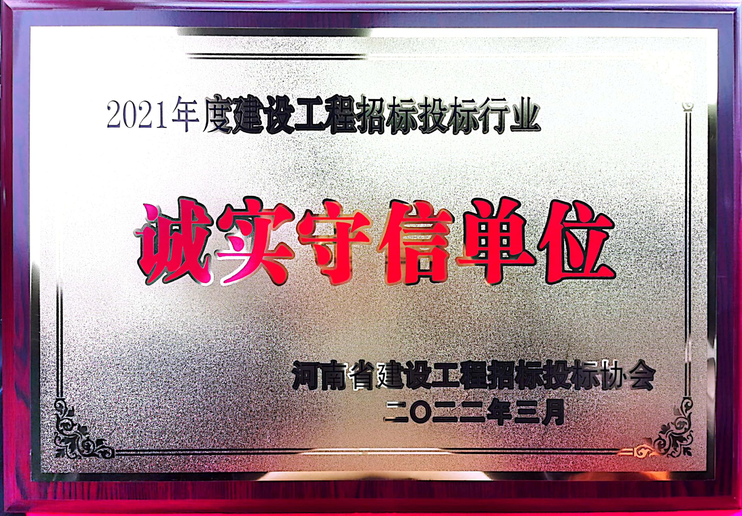 河南省偉信招標(biāo)管理咨詢有限公司榮獲河南省建設(shè)工程投標(biāo)協(xié)會(huì)頒發(fā)的2021年度建設(shè)工程招標(biāo)投標(biāo)行業(yè)誠(chéng)實(shí)守信單位