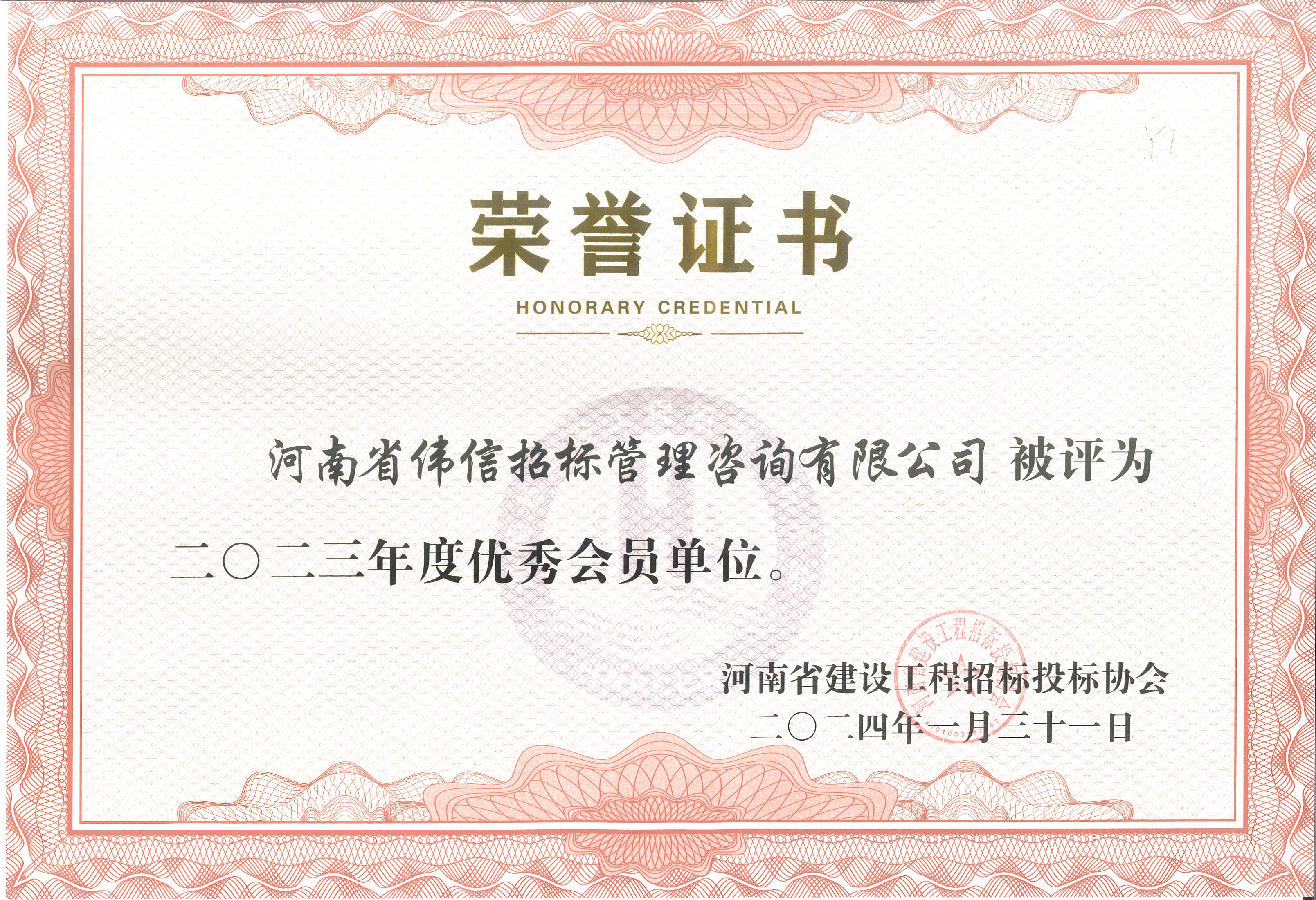 河南省偉信招標(biāo)管理咨詢有限公司榮獲河南省建設(shè)工程招標(biāo)投標(biāo)協(xié)會頒發(fā)的2023年度優(yōu)秀會員單位